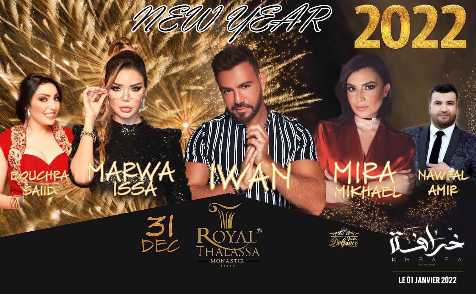 Vendredi 31/12/2021 : Soirée 100% orientale , animée par le Super Star LIBANAIS ‘IWAN’, La talentueuse de Star Academy ‘Mira Mikhael’, la célèbre chanteuse tunisienne ‘Marwa Issa’ , la chanteuse ‘Bouchra Said’& le jeune ‘Nawfal Amir’ . Cette grande soirée est animéepar la troupe DEL PIERO.A tout cela s’ajoute un Menu savoureux concocté par les chefs de THALASSA.