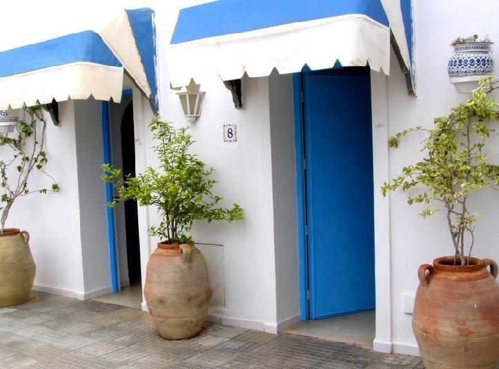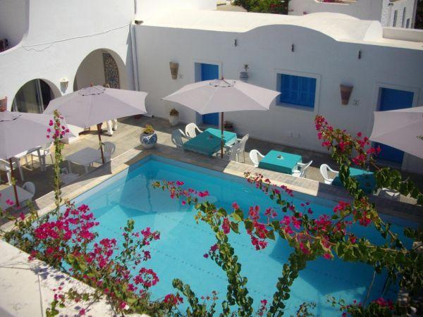 (construites autour d’un patio fleuri avec piscine au centre)