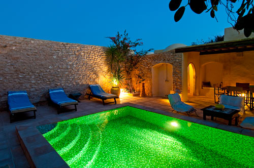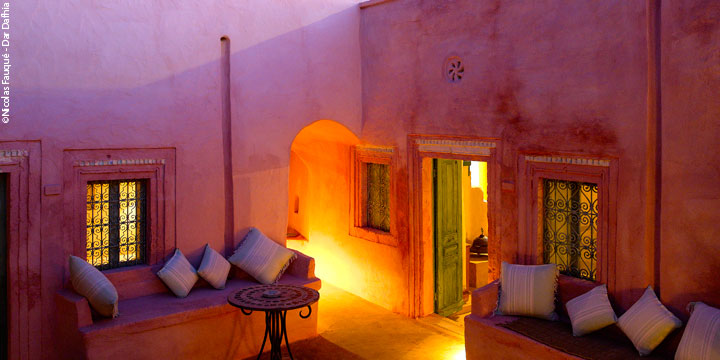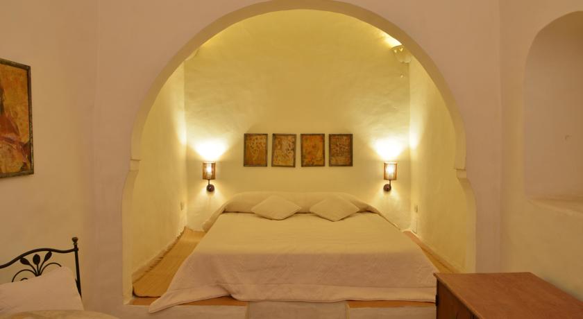 Les neuf chambres et les cinq suites sont toutes uniques et disposent d’une salle de bains à part. Elles sont toutes équipées d’un grand lit en fer forgé ou en « doukana » (estrade), installé sous une coupole. Chaque chambre est climatisée et donne sur un patio ombragé ou sur l’une des piscines.