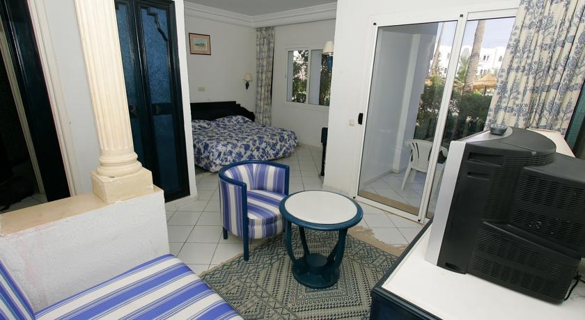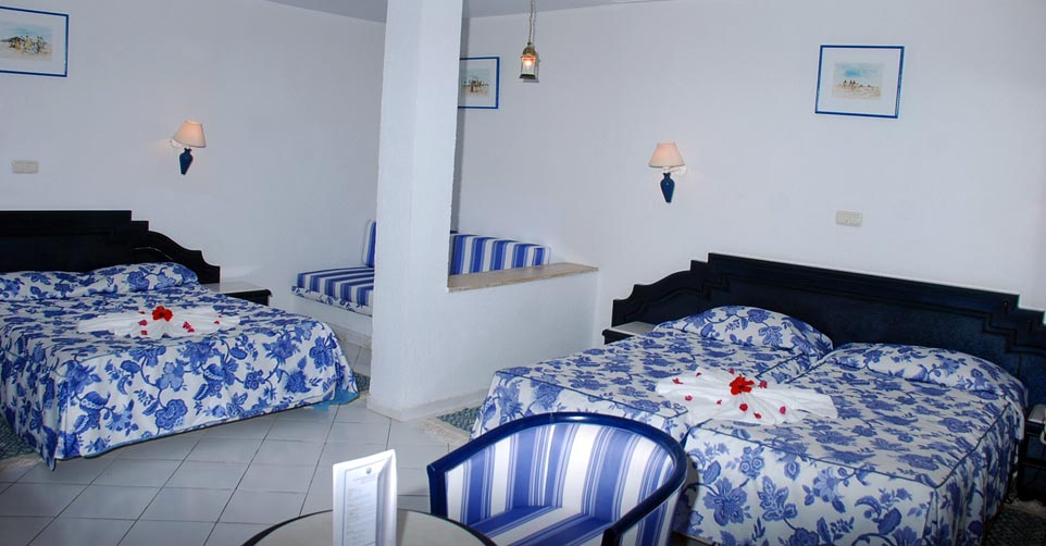 L’hôtel dispose de 148 chambres avec coin salon et banquette pouvant faire office de 3ème lit pour adulte ou enfant, téléphone et télévision (satellite) mini bar et coffre-fort (en supplément). Salle de bain spacieuse avec WC séparée, sèche-cheveux et téléphone. L’agencement est de qualité, avec un mobilier fabriqué en bois noble, un décor de tapisserie, des doubles rideaux épais et joliment fleuris, une lustrerie irréprochable et bien conçue. Chaque chambre est agrémentée d’une loggia pour le rez-de-jardin et d’un balcon pour celles situées en étage. Espace et agencement judicieux permettent d’accueillir les familles dans les meilleures conditions de confort souhaitées (24 paires de chambres communicantes). Hors balcon, la superficie des chambres est d’environ 32 m2. Wifi gratuit uniquement dans les locaux communs.